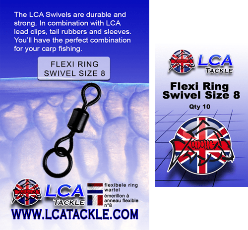 The LCA flexi ring swivel is a swivel with an extra large ring attached. This larger ring makes this swivel perfect in for example a helicopter system, where the large ring can move freely over the main line. The swivel is a size 8 and a package contains 10 pieces.