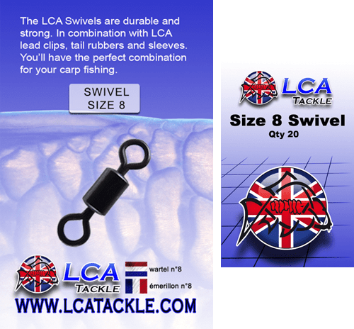 The LCA swivel is a very strong swivel which you can use in different manners. For example, use it to attach your mainline to your rig, in combination with a lead clip system. The swivel is a size 8 and there are 20 swivels in a package.